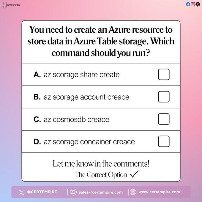 #AZ900 #MicrosoftAzureAzure pros, what’s the correct command? 🤔 Drop your answer below! #AzureCertification #AzureExam #AZ900 #MicrosoftAzure0 Comments 0 Shares 106 Views 0 Reviews