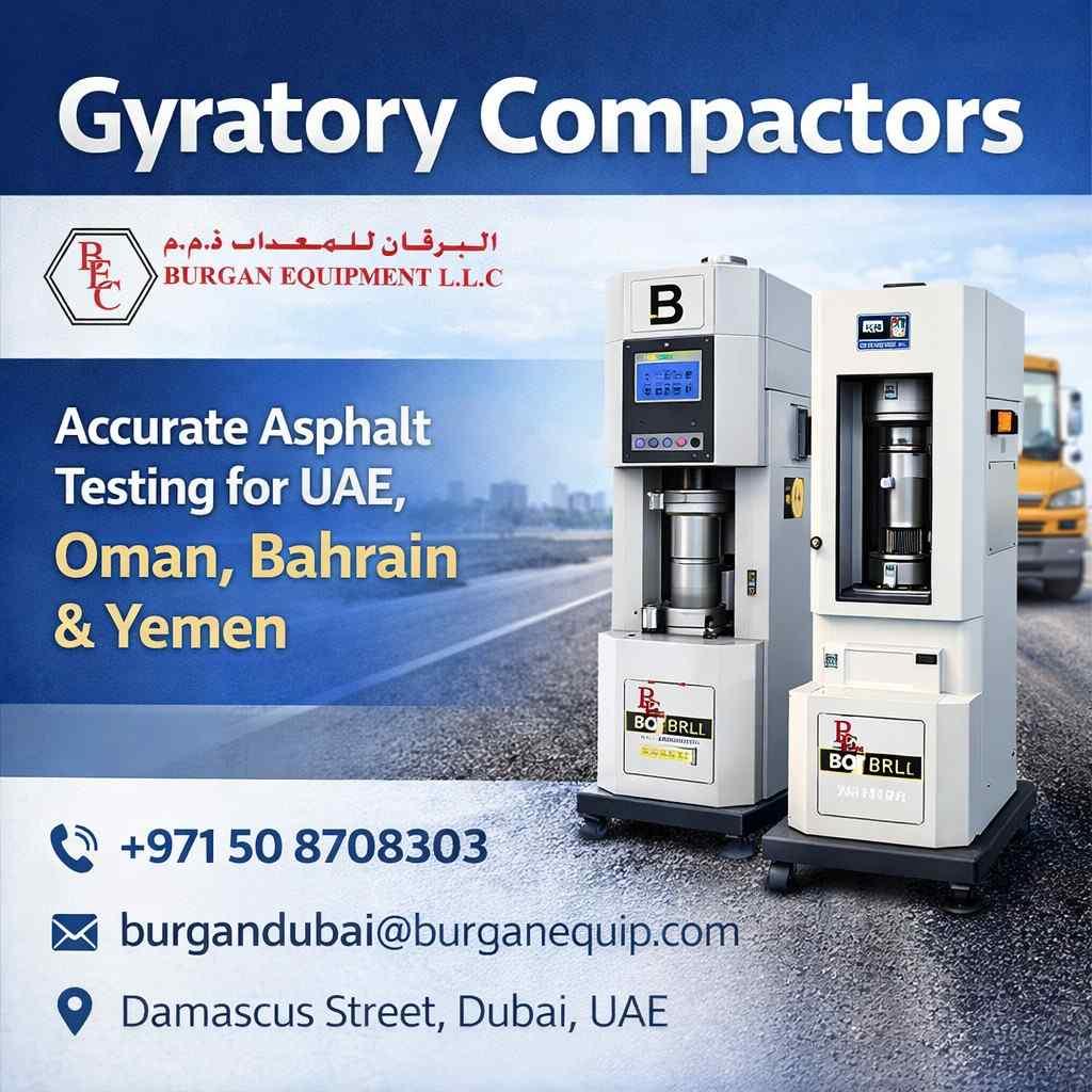 Accurate asphalt mix design requires consistent compaction and repeatable results, especially for lab testing and QA/QC verification. Burgan UAE supplies advanced Gyratory Compactors in UAE, Bahrain, Oman, and Yemen designed to support standardized asphalt specimen preparation for road, highway, and infrastructure projects across the region.