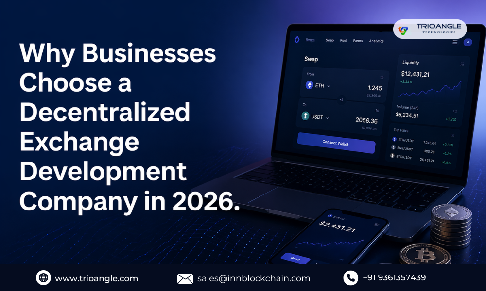 Why Businesses Choose a Decentralized Exchange Development Company in 2026 Crypto users now expect secure, wallet-based trading without centralized control. That is why many startups are searching for a Decentralized exchange development Company to build scalable DeFi trading platforms with modern features. From token swap integration and liquidity pool setup to multi-chain DEX solutions and smart contract automation, the right development team can speed up launch time and reduce technical risk. A reliable Decentralized exchange development Company can also help businesses create custom trading interfaces, staking modules, yield farming systems, and advanced admin dashboards. If you are planning to launch a crypto exchange platform, choosing experienced blockchain developers can make a major difference. Explore more: https://www.trioangle.com/decentralized-exchange-development/ Telegram: @teaminnblockchain | WhatsApp: +91 9361357439 | Email: sales@innblockchain.com
